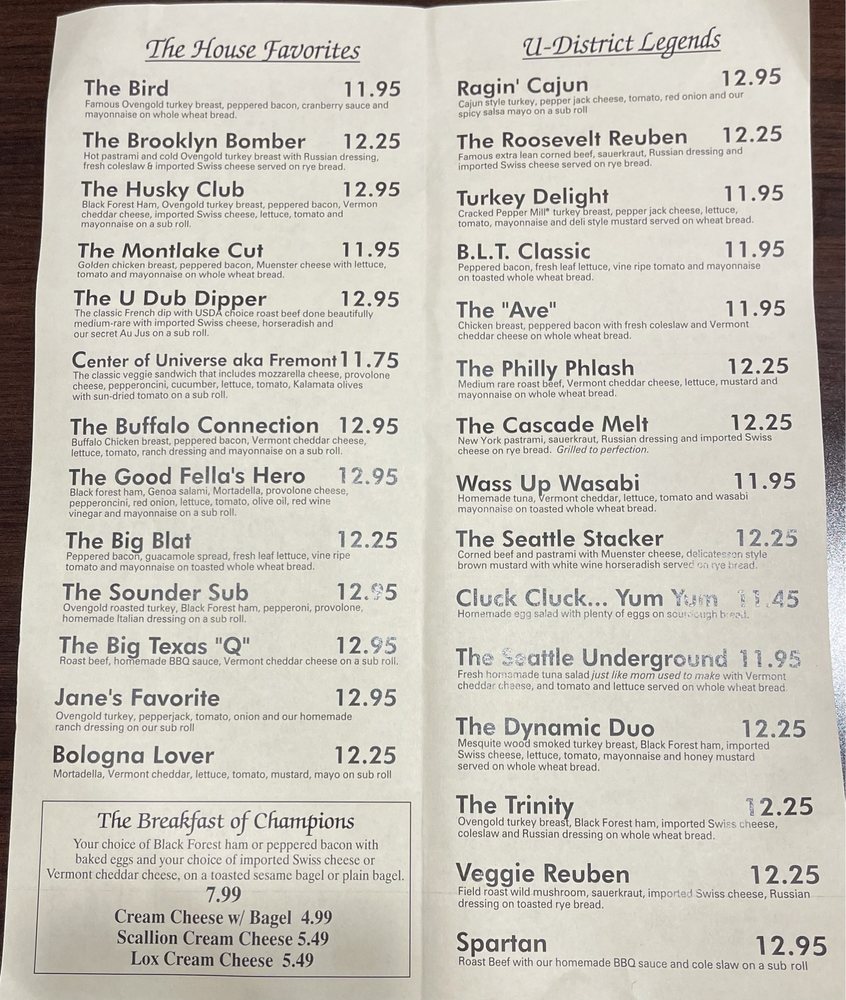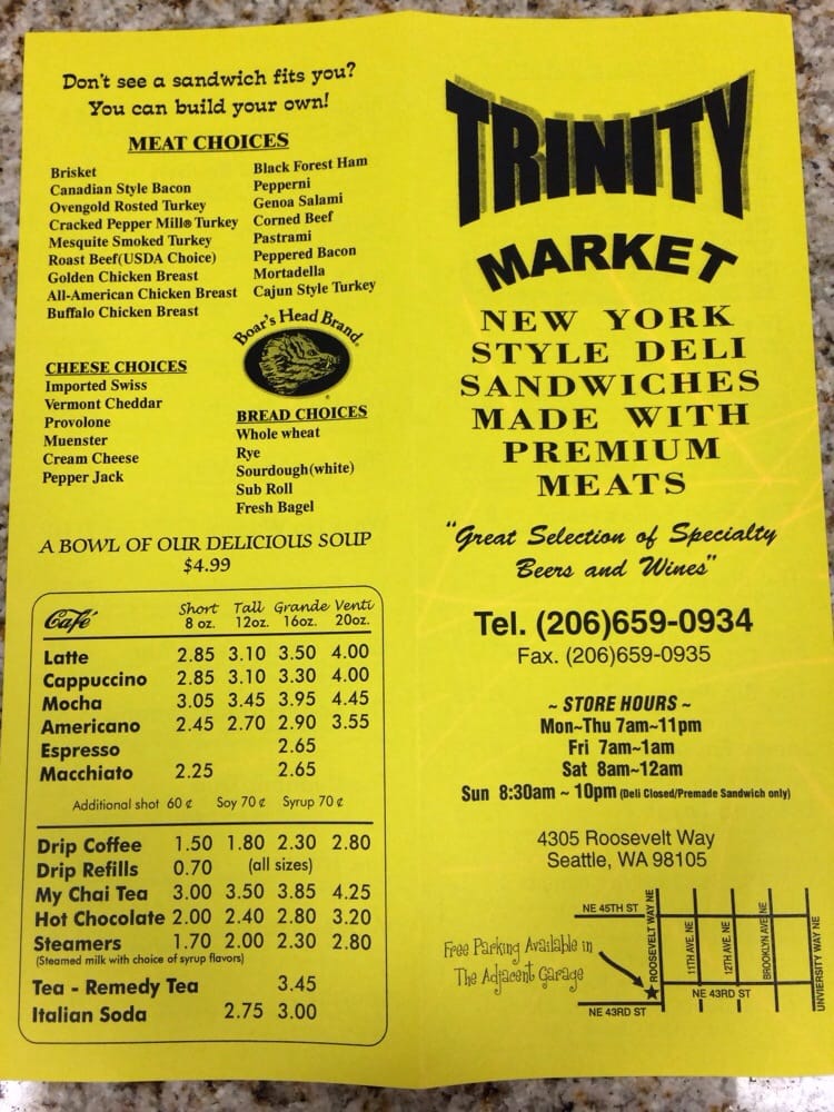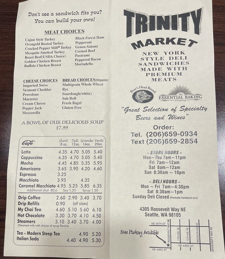 Trinity Market, a hidden gem in Seattle's U-District, offers a unique blend of deli sandwiches, grocery items, and specialty coffees and teas. With a cozy atmosphere and friendly service, Trinity Market has quickly become a favorite among locals and visitors alike. Their menu features mouthwatering options like The Cascade Melt, The Big BLAT, and Jane's Favorite sandwich. Customers rave about the quality of the food and the attention to detail from the owners. The convenient location, free parking, and free Wi-Fi make Trinity Market a perfect spot for a quick lunch or a productive work session. Whether you're a sandwich lover or looking for a new favorite coffee spot, Trinity Market has something for everyone. Don't miss out on trying their delicious sandwiches and outstanding craft beer selection. Highly recommended for a satisfying meal in a welcoming environment.